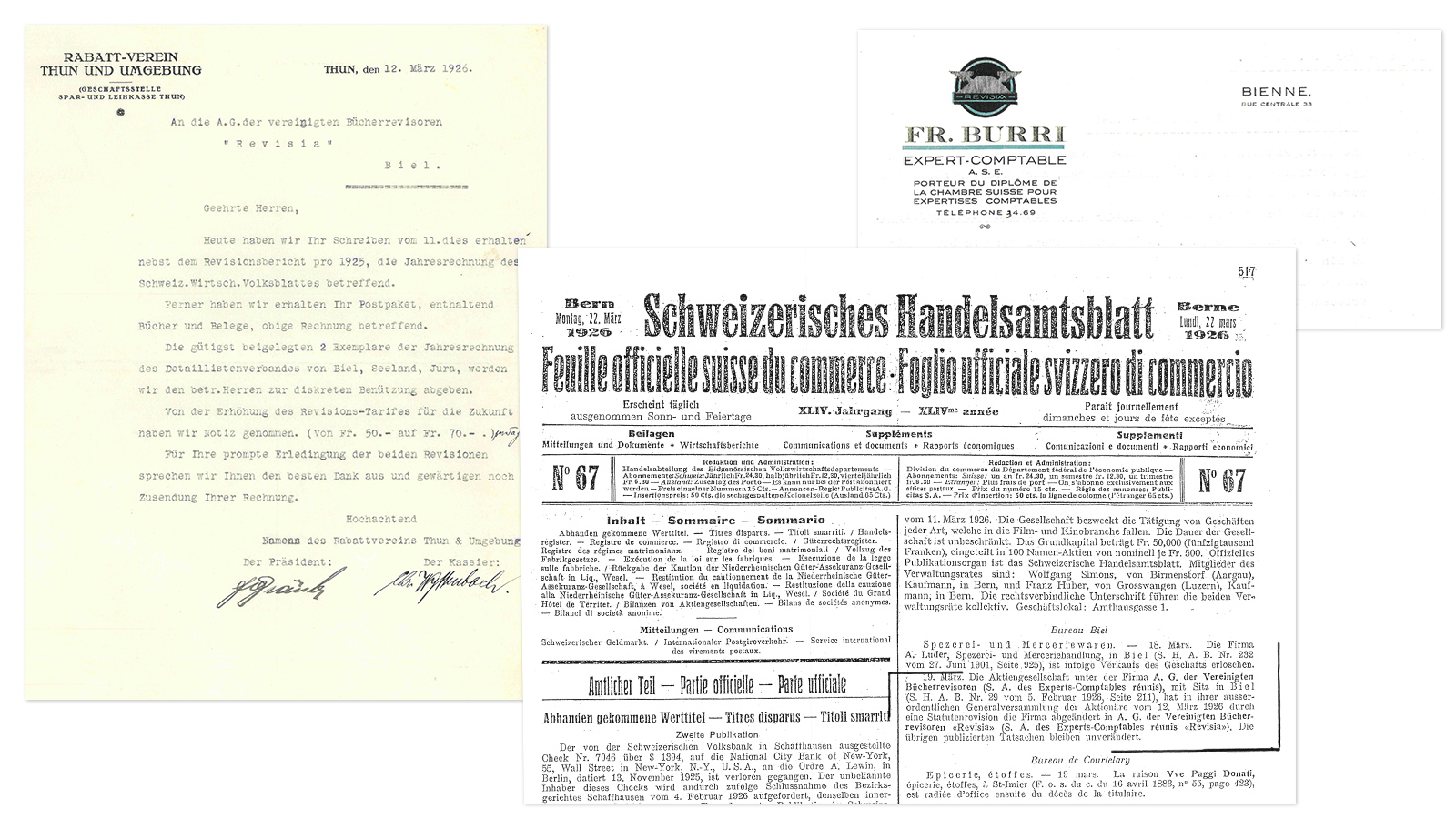 Gründung der „AG der Vereinigten Bücherrevisoren Revisia“ durch Fritz Burri, Ernst Zulauf und Josef Badet. Diese Firma bildet die Grundlage unserer heutigen Treuhandgesellschaft.